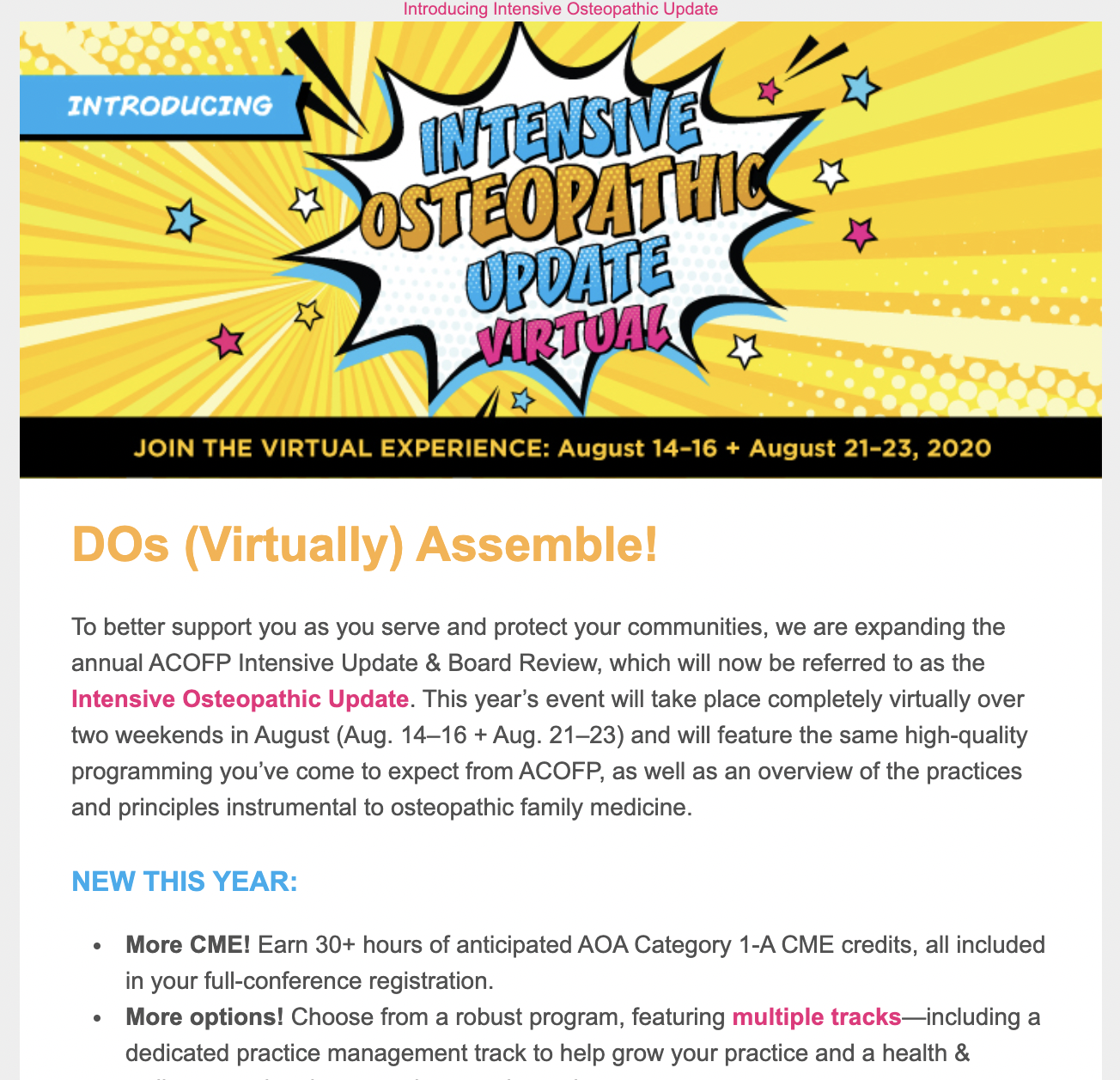 I co-created the branding and wrote the majority of event copy for the highly successful Intensive Osteopathic Update conference. Our branding efforts received an Association Media & Publishing EXCEL Award.